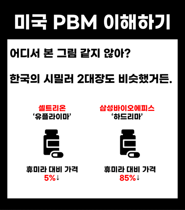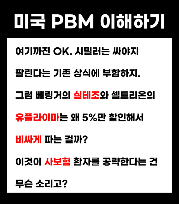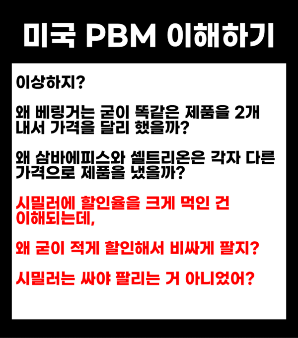 어려운 이야기 같지만, 핵심만 짚어서 보면 간단합니다. 바이오시밀러 이중가격과 미국 PBM의 비밀에 대해 이해하기 쉽도록 카드뉴스로 설명드립니다.