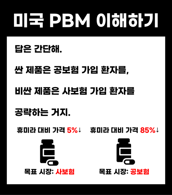 이는 미국 바이오시밀러 시장에서 최근 채택되기 시작한 '이중가격(Dual pricing)' 전략입니다. 이런 전략이 취해지는 배경에는 미국 사보험 시스템의 PBM(Pharmacy Benefit Managers)이 있고요.