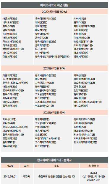 이런 교육환경을 기반으로 한국바이오마이스터고등학교는 90% 이상의 취업률을 보이고 있다. 2022년 기준 바이오제약과 졸업생들은 △지씨쎌(14명) △대원제약(9명) △유바이오로직스(8명) △코오롱바이오텍 (4명) △한국유나이티드제약(3명) △한미 약품(2명) △나이벡(2명) △대웅제약(2명) △동아ST(1명) △유영제약(1명) △하나제약(1명) 등의 기업으로 입사했다.