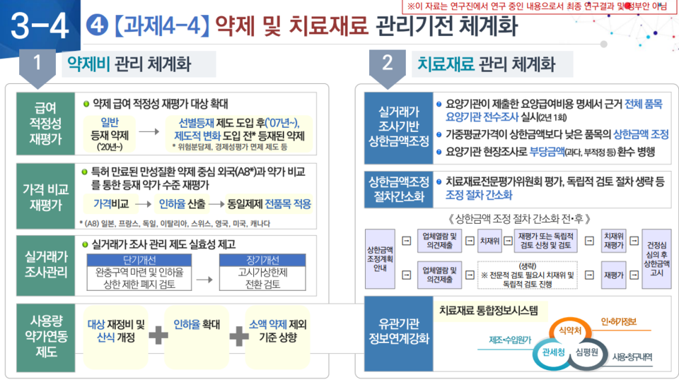 실제 약제 급여적정성 재평가를 지속적으로 시행할 계획으로, 대상을 선별등재 제도 도입 이후, 위험분담제 등의 제도 도입 전에 등재된 약제까지 확대해 진행함으로써 약제비 관리를 체계화하겠다는 계획이 담겼다.