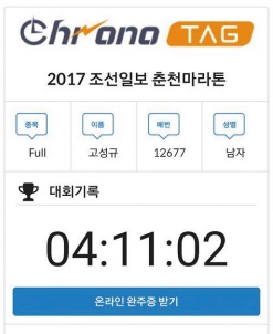 "2017년 10월 29일, 우리나라에서 가장 오랜 역사를 가지고 있고, 멋진 풍경의 춘천 의암호를 도는 '춘천마라톤'에서 4시간 11분 2초의 꽤 괜찮은 기록으로 첫 완주를 했습니다. 최고 기록은 2018년 3월 '서울국제마라톤'에서 세운 4시간 6분입니다. 이 기록은 아직 깨지 못하고 있고, '서브4(마라톤 풀코스를 4시간 이내로 완주하는 것)'도 아직 못하고 있습니다. 아마 제 직업상 훈련 시간이 절대 부족한 데다 나이가 점점 먹어가면서 못 깰 가능성이 높고요. 그렇지만 즐겁게 완주만 해도 행복할 것 같습니다."