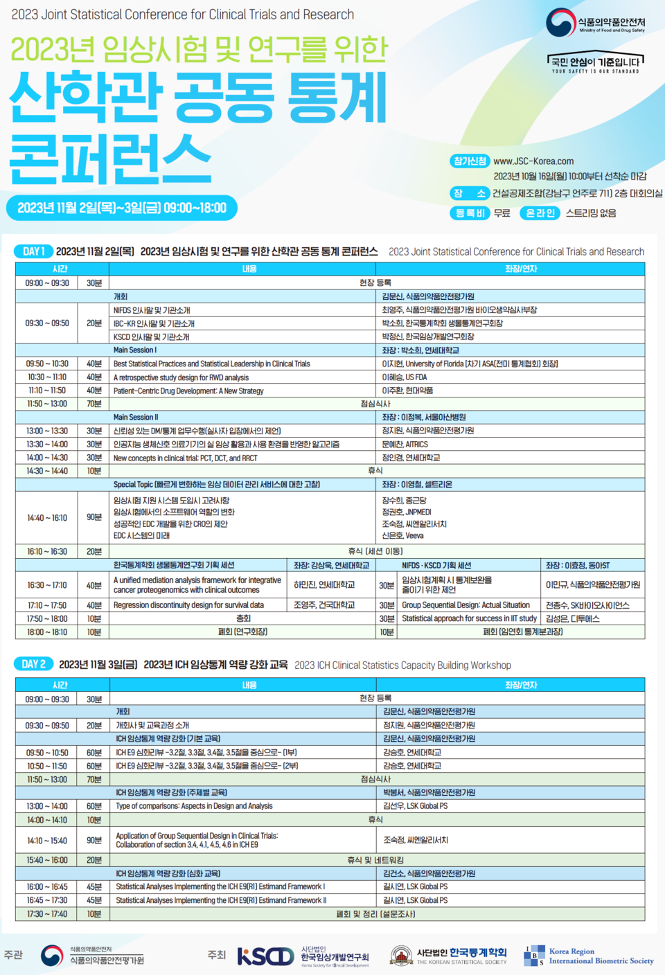 첫째 날인 2일에는 '2023년 산·학·관 공동 통계 콘퍼런스'를 열고 임상 통계분석 관련 전문가 발표와 논의를 진행한다. 콘퍼런스의 주요 내용은 △임상시험에서의 통계적 모범사례 △자료관리·통계분석에 대한 신뢰성 확보 방안 △임상시험 관련 새로운 개념 설명 △임상시험계획 시 통계보완을 줄이기 위한 제언 등이다.