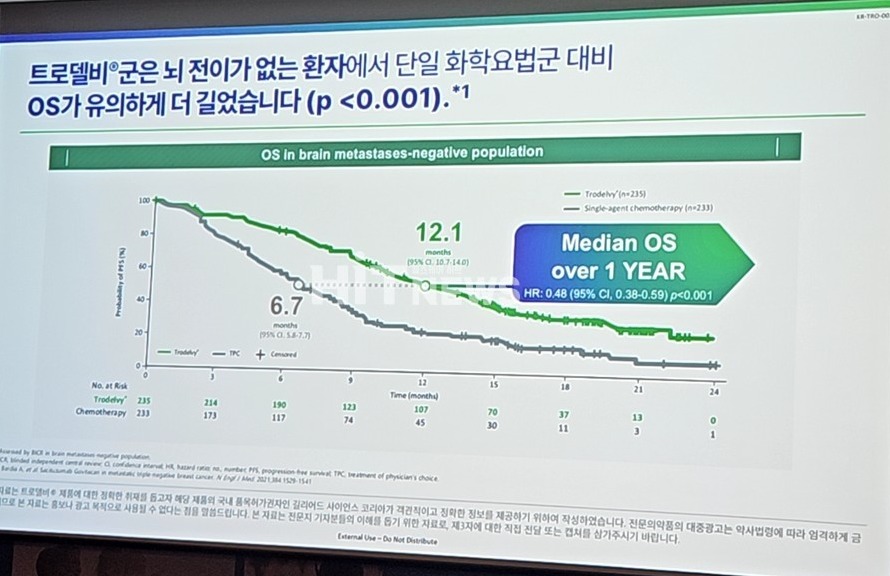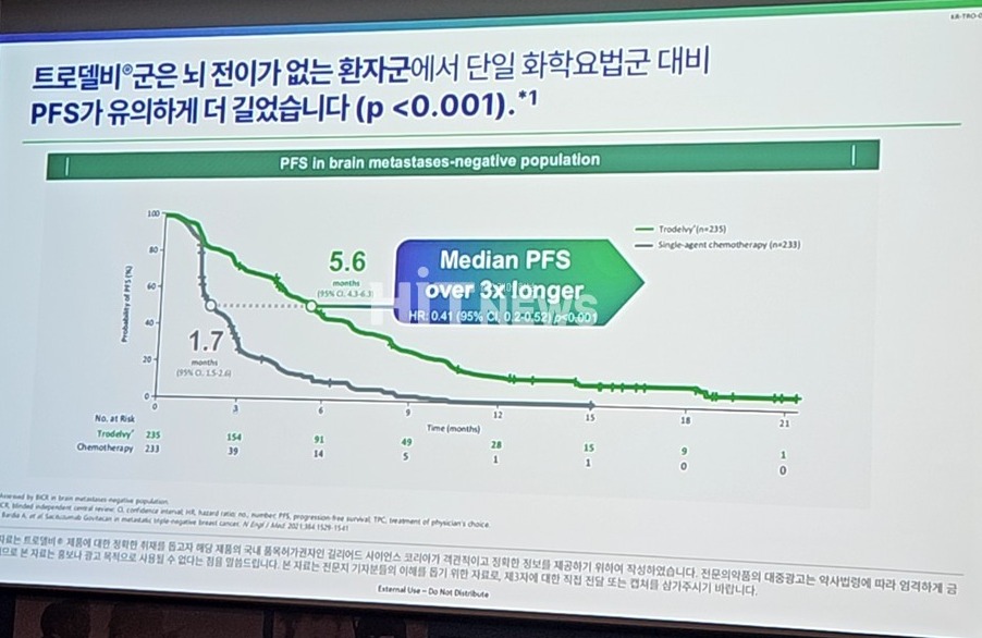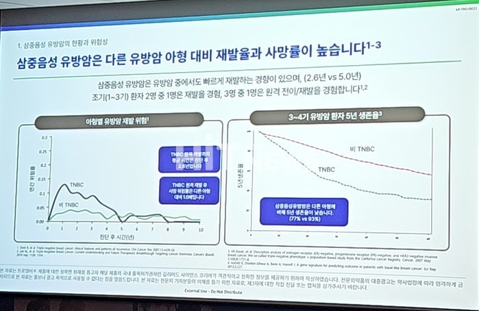 김지형 교수는 "주로 전이는 폐와 뇌 등 내장기관으로 잘 일어나는데, 실제 전이성 삼중음성유방암으로 진단된 환자의 경우 평균 생존기간이 1~2년 내외라고 조심스럽게 말하고 있다"며 "그만큼 공격도가 높고, 치료옵션이 없는 질환에 대해 트로델비라는 치료옵션이 생긴 것은 긍정적"이라고 강조했다.