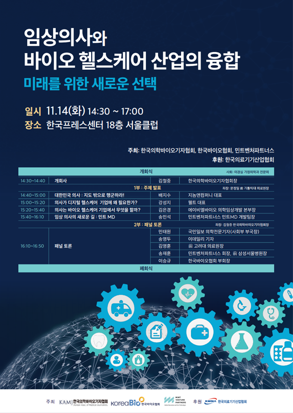 #한국바이오협회 #한국의학바이오기자협회 #민트벤처파트너스 #한국의료기기산업협회 #지놈앤컴퍼니 #웰트 #에이비엘바이오 #임상의사와 바이오 헬스케어 산업의 융합: 미래를 위한 새로운 선택