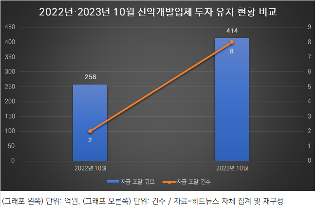 12일 히트뉴스가 자체 집계 및 분석한 바에 따르면, 총 8곳의 신약 후보물질을 파이프라인으로 확립한 업체들이 지난달(주금 납입일 기준) 자금 조달을 마쳤다. 10월 한 달간 펀딩을 마친 총 16곳의 바이오ㆍ헬스케어 업체의 절반에 해당한다. 각각 항암신약 개발업체(온코크로스ㆍ셀레메디ㆍ셀비온)와 중추신경계(CNS)를 포함한 신경질환 치료제 개발업체(메디노ㆍ스탠드업테라퓨틱스ㆍ몰젠바이오)가 3곳이었다. 이밖에 대사질환 치료제 개발사 1곳(엘피스셀테라퓨틱스), 섬유화증 치료제 개발업체 1곳(에프엔씨티바이오텍)으로 집계됐다.