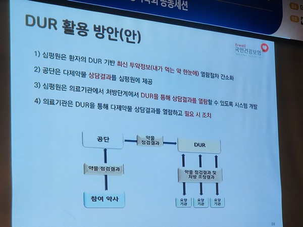 또 심평원 데이터를 통한 최신 투약 이력 및 이를 DUR에 즉각 반영하는 프로그램도 구축하겠다는 방침이다. 한 과장은 "'내가 먹는 약 한눈에' 서비스 등으로 최신 투약 이력을 확인하고, 이에 대한 다제약물 상담 서비스를 진행한 후 해당 상담 결과를 DUR에 연동하는 모델을 구상 중"이라고 덧붙였다.