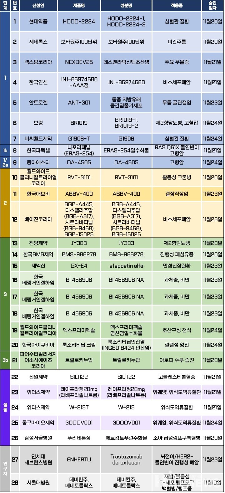 임상시험계획은 총 28건이 승인됐다. 세부적으로 △1상 7건 △1b 1건 △1/2a상 1건 △2상 3건 △3상 8건 △3b상 1건 △생물학적동등성 5건 △연구자 임상 2건 등이다. 이 임상시험들은 심혈관질환, 미간주름, 제2형 당뇨병, 고혈압, 무릎 골관절염, 크론병, 폐섬유증, 아토피 수부 습진 등의 질환과 비소세포폐암, 결장직장암, 백혈병 등 암종을 대상으로 승인됐다.
