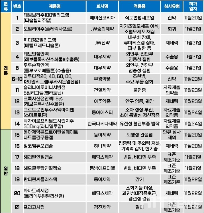 지난주(11월 20~24일) 총 21개 품목이 식품의약품안전처로부터 품목허가를 받았다. 전문의약품은 14개 품목, 일반의약품은 7개 품목이었다. 이 의약품들은 식도편평세포암, 조현병, 불면증, 소아 성장 부진, 유전성 혈관부종 발작 등 다양한 적응증으로 허가됐다.