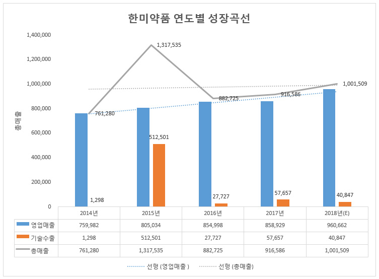 기술수출을 통해 2015년 매출 1조를 첫 달성했던 한미약품이 2018년에는 일반 영업매출 성장을 통해 매출 1조 달성을 가시권에 두고 있다.