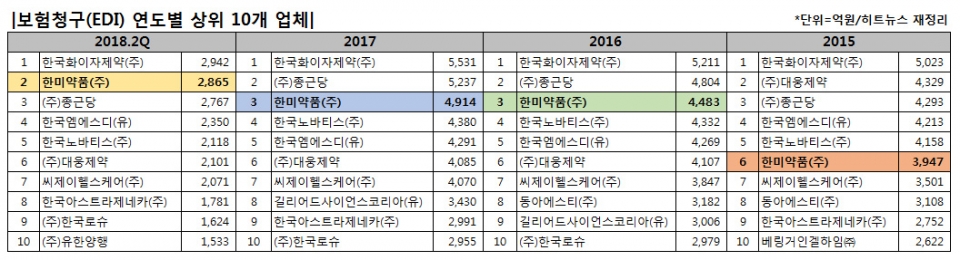 건강보험 청구실적을 통해서도 이 같은 흐름은 확인된다. 한미약품은 올 상반기까지 총 2865억을 청구해 2942억을 기록한 화이자에 이어 2위로 뛰어 올랐다. 상반기 청구액을 단순 배수한 수치로 2017년 실적과 비교하면 성장률은 최소 16%를 넘어선다.