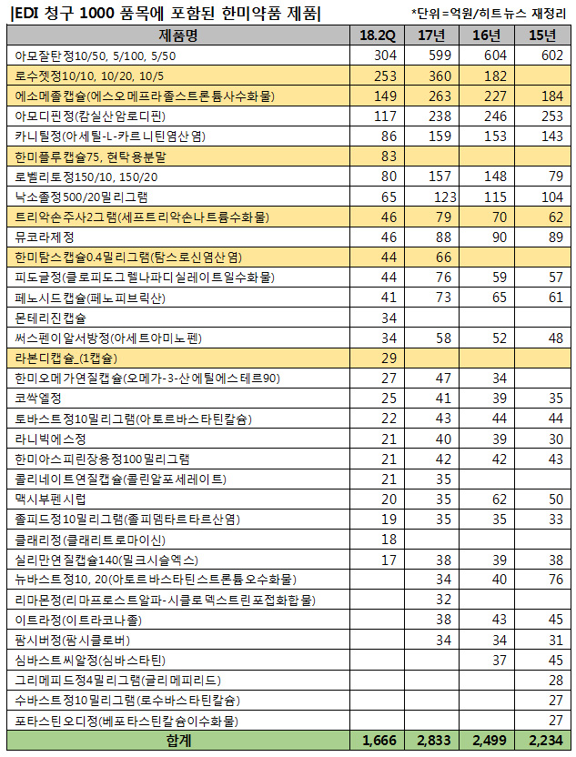 품목별 청구액 순위 1000품목에 진입한 한미약품 제품은 총 26개로 2018년 상반기까지 1666억을 기록했다. 이 수치를 같은 방식으로 환산해 전년과 비교하면 성장률은 17.6%이다. 로수젯정(506억), 에소메졸캡슐(298억), 한미플루캡슐(166억), 트리악손주사(92억), 한미탐스캡슐(88억) 등이 성장을 주도했다. (상반기 기준 추정치)