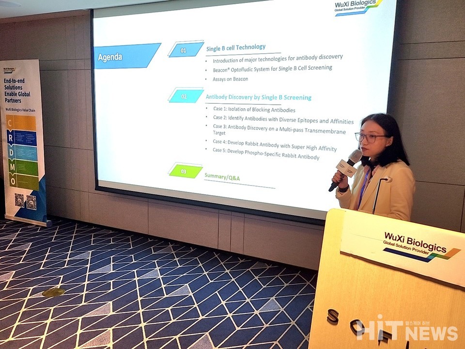 우시바이오로직스는 지난 22일 소피텔 엠버서더 서울에서 'Successful Biologics Start with Great Discovery'를 주제로 세미나를 개최했다. 이날 세미나에는 왕줘즈(George Wang) 우시바이오로직스 부사장, 쉬젠칭(Jianqing Xu) 바이오신약연구개발서비스부 고급주임 등이 참석해 △자사 약물화 전략 △단일 B세포 스크리닝 기반 항체 약물 발견 △항체약물접합체(ADC) 개발 사례를 공유했다.