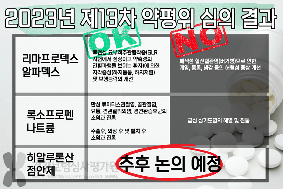업계에서 예상하고 있었던 '리마프로스트알파덱스'의 버거병 관련, '록소프로펜'의 상기도염 적응증이 결국 급여적정성 없음 판정을 받았다. 그러나 정작 업계 내에서도 초미의 관심사였던 '히알루론산 점안제'는 급여기준(안)을 추가 검토하기로 결정하면서 해당 제제를 보유한 제약사는 급여 향방을 더 지켜봐야 할 전망이다.