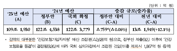 국회 의결을 거쳐 보건복지부(장관 조규홍) 소관 2024년도 예산 및 기금운용계획의 총지출 규모가 122조 3779억 원으로 확정됐다. 이는 2023년 예산인 109조 1830억 원 대비 13조 1949억 원(12.1%) 증가된 규모다.