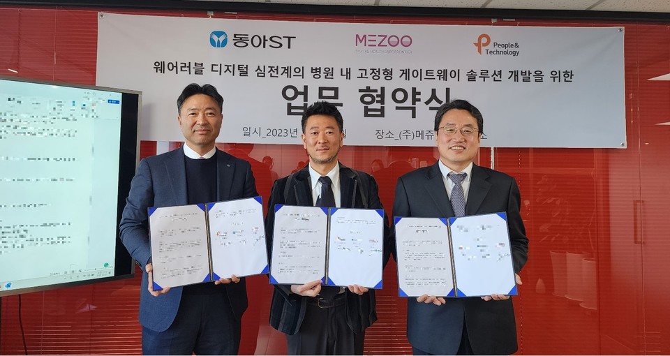 동아에스티(대표이사 사장 김민영)는 서울시 강남구 메쥬 사무실에서 메쥬(대표이사 박정환), 피플앤드테크놀러지(공동대표 홍성표, 임진순)와 병원 내 실시간 환자 모니터링을 위한 IoMT(의료기반 사물인터넷) 게이트웨이 솔루션 개발 및 플랫폼 구축을 위한 업무 협약을 체결했다고 22일 밝혔다.
