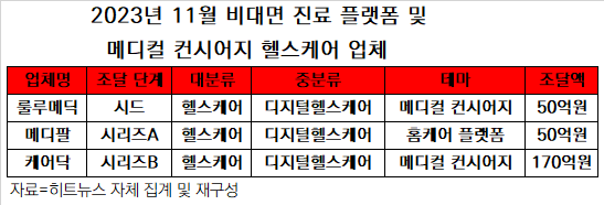24일 히트뉴스가 자체 집계해 분석한 바에 따르면, 지난 11월 헬스케어 섹터에서 비대면 진료와 관련한 사업으로 자금을 조달한 업체는 총 3곳이다. 각각 시니어케어(노인 돌봄)를 앞세운 케어닥(시리즈 B, 170억원)과 홈케어 서비스를 제공하는 메디팔(시리즈 A, 50억원), 그리고 먼저 해외에서 비대면 진료의 활로를 찾는 룰루메딕(시드, 50억원) 등이다.