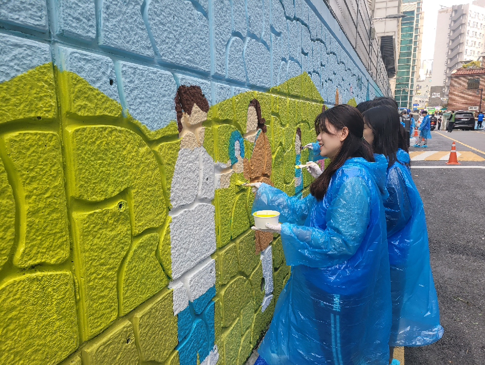 지난 11월 3일 서울 동대문 회기역 일대에서 벽화 그리기 봉 사활동을 진행하는 ‘28기 동아멘토링’ 멘토와 멘티들 / 사진= 동아쏘시오그룹