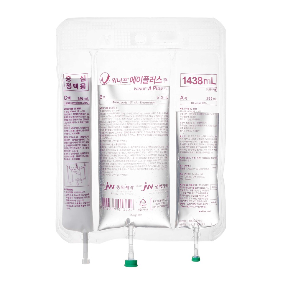 위너프에이플러스주는 국내 종합영양수액제 시장에서 점유율 1위인 종합영양수액제 '위너프'의 특징은 그대로 유지하고, 아미노산의 함량을 높인 제품이다. 국내 제약사가 국내 임상 3상을 통해 고함량 아미노산 종합영양수액제를 출시한 것은 이번이 처음이라는 게 JW중외제약 측 설명이다.