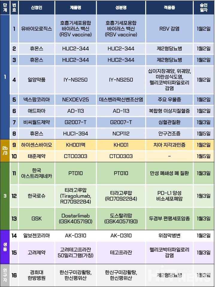지난주 임상시험계획은 총 16건이 승인됐다. 세부적으로 △1상 8건 △2b/3상 2건 △3상 3건 △생물학적 동등성 2건 △연구자 임상 1건 등이다. 이 임상시험들은 호흡기세포융합바이러스(RSV) 감염, 위ㆍ십이지장궤양, 헬리코박터파일로리 감염, 안구건조증, 이상지질혈증, 치아지각과민증 등 질환과 PD-L1 양성 비소세포폐암, 두경부 편평세포암종 등 암종을 대상으로 승인됐다.