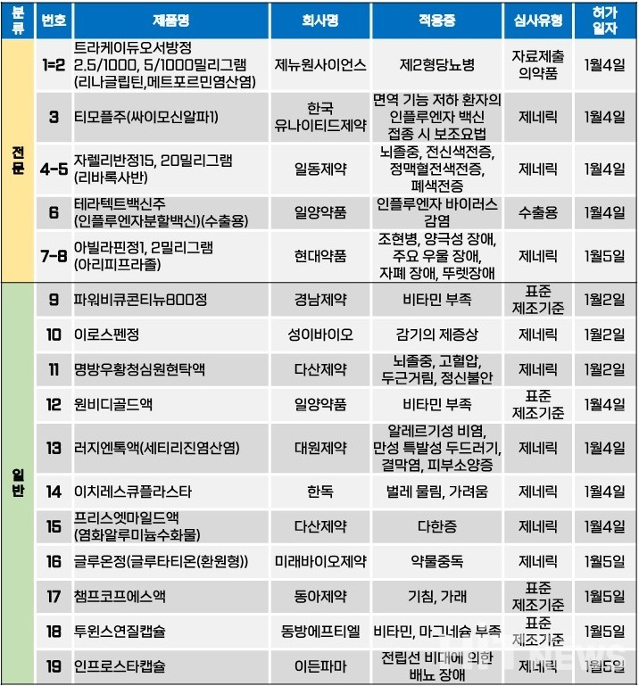 지난주(1월 2~7일) 총 19개 품목이 식품의약품안전처로부터 품목허가를 받았다. 전문의약품은 8개 품목, 일반의약품은 11개 품목이었다. 이 의약품들은 제2형 당뇨병, 인플루엔자 백신 접종시 보조요법, 뇌졸중, 색전증, 조현병, 주요 우울장애 등 다양한 적응증으로 허가됐다.