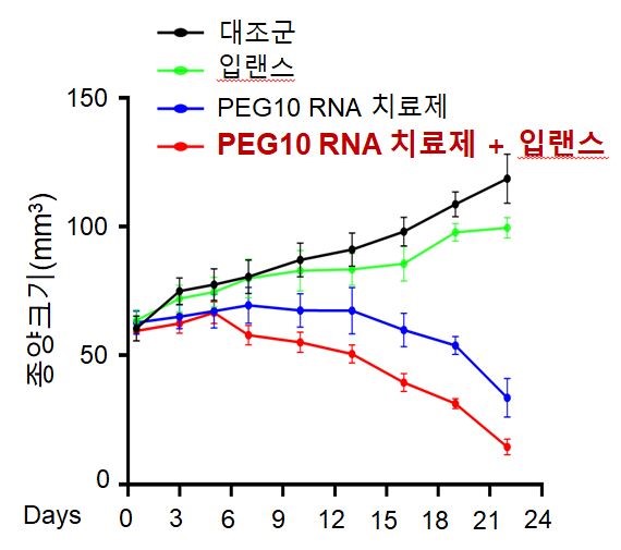 이어 대표적인 CDK 4/6 억제제인 '입랜스(성분 팔보시클립)'에 내성을 보이는 전이성 유방암 동물 모델을 개발해 PEG10 RNA 치료제를 병용 투여했다. 이 모델에서 입랜스 단독 투여시 종양 크기가 계속 커져 항암 효과가 없었다. 하지만 PEG10 RNA 치료제를 단독 투여시 종양 크기가 76% 감소, PEG10 RNA 치료제와 입랜스를 병합 투여시 종양크기가 85% 감소로 줄어드는 항종양 효과를 보였다.