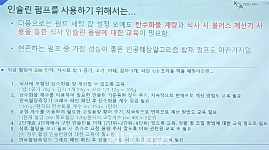 김 교수에 따르면, 실제로 의사가 환자의 인슐린 펌프 조건을 설정하기 위해선 다양한 데이터 및 분석이 필요하다. 구체적으로 △탄수화물 계수 △교정 계수 △인슐린 작용시간 △인슐린 PEAK TIME △추세 적용시간 △교정 목표 △혈당 교정범위 △하한 설정 등을 설정해야 한다.