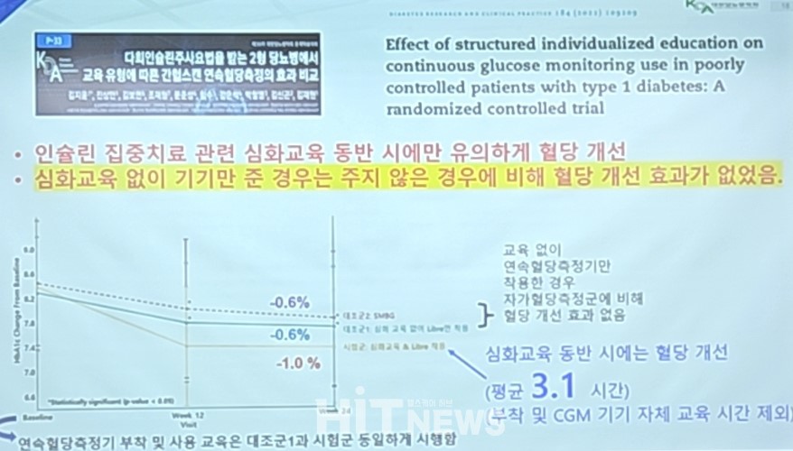 김 교수는 "의료진의 치료ㆍ관리 없이 기기만 줘서는 혈당 조절 효과는 미미하다"고 강조했다. 그러면서 그는 실제로 다기관 무작위 대조군 임상 연구를 수행한 결과(1형 당뇨병 환자 및 다회 인슐린 주사요법 시행 2형 당뇨병 환자 대상), 기기와 관련된 심화 교육 없이 연속혈당측정기만 착용한 경우, 자가혈당측정군에 비해 혈당 개선 효과(혈당 감소 0.6% 차이)가 없었다고 설명했다. 다만, 평균 3.1시간의 심화교육을 동반한 경우에는 1%의 추가 혈당감소를 보였다고 덧붙였다.