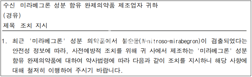 14일 업계에 따르면, 식약처는 지난 8일 미라베그론 성분 제제 허가를 보유한 완제의약품 제조사를 대상으로 조사 지시 공문을 발송했다. 공문 내용에는 "최근 미라베그론 성분 의약품에서 'N-니트로소 미라베그론(N-nitroso-mirabegron)' 불순물이 검출됐다는 안전성 정보에 따라, 사전예방적 조치를 위해 귀사에서 제조하는 해당 성분 완제의약품에 대해 약사법령에 따라 다음 조치를 취하니 협조해달라"고 적혀 있다.