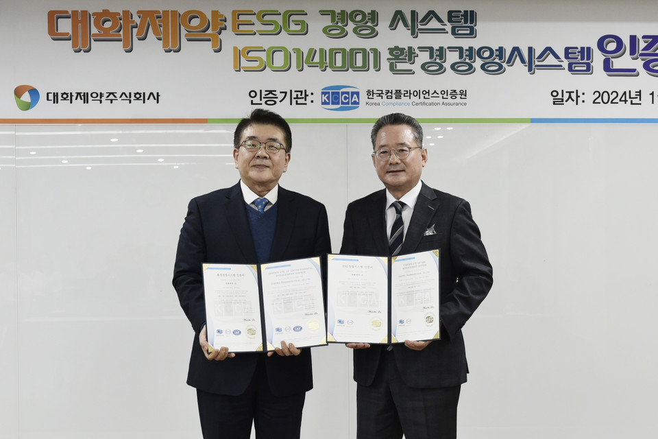 대화제약(대표 노병태ㆍ김은석)은 한국컴플라이언스인증원(KCCA)에서 최근 ISO 14001(환경경영시스템)과 지난 15일 ESG 경영시스템 인증을 연이어 취득했다고 17일 밝혔다. 두 인증 수여식은 17일 열린 대화제약 서울사옥에서 열렸다.