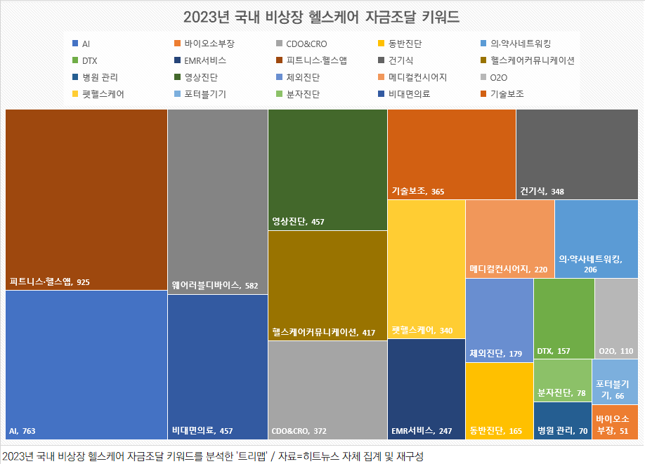 어느새 헬스케어 자금 조달 시장 '전통의 강자'로 자리잡은 AI가 피트니스ㆍ헬스앱의 뒤를 이었다. AI 기반 환자 맞춤형 항암제 효능 예측 등 정밀의료 서비스를 제공하는 임프리메드가 프리시리즈 A 라운드에서 300억원을 모은 게 컸다. 이어 환자의 상태를 AI 소프트웨어가 예측하는 '바이탈케어'로 식품의약품안전처 허가를 따낸 에이아이트릭스(시리즈 Bㆍ150억원), 바디프랜드 계열사로 AI 기반 심전도 분석 소프트웨어를 개발한 메디컬에이아이(기타ㆍ100억원)가 조달 상위에 자리했다.