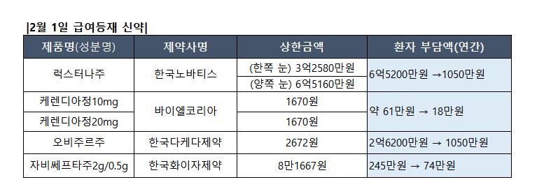 보건복지부는 2월 1일부터 유전성 망막위축 환자 치료제 '럭스터나주(성분 보레티진네파보벡)'와 만성 신장병 치료제 '케렌디아정(성분 피네레논)', 후천성 혈우병A 치료제 '오비주르주(성분 서스옥토코그알파 돼지혈액응고 Ⅷ인자)', 다제내성균 항생제 '자비쎄프타주(성분명 세프타지딤ㆍ아비박탐)' 등 4가지 신약을 신규로 급여 등재해 중증 환자의 치료 접근성을 높이고 환자의 경제적 부담을 완화한다고 24일 밝혔다.
