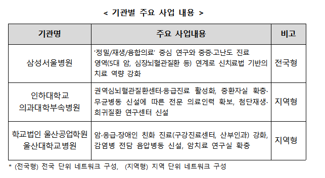 이번에 선정된 △삼성서울병원 △인하대병원 △울산대병원 등은 적시에 중증 환자에 대해 보다 질 높은 진료서비스를 제공하기 위해 필요한 인력, 시설, 장비 등을 확충한다. 또 참여 유형에 따라 전국 또는 지역 단위의 진료 협력 기관과의 협력체계(네트워크)를 구축해 환자를 의뢰ㆍ회송하고 진료 협력을 지원하기 위한 전담 인력도 대폭 확충한다. 환자가 지역 병ㆍ의원에서도 안심하고 적정 진료를 받을 수 있도록 상급종합병원, 지역의료기관과의 진료 정보 공유, 의료진 교육 지원 등 진료 협력 구조를 강화하며 회송된 환자에 대해 상급종합병원 진료가 필요한 경우 신속하게 우선 진료받을 수 있는 시스템도 단계적으로 구축한다.