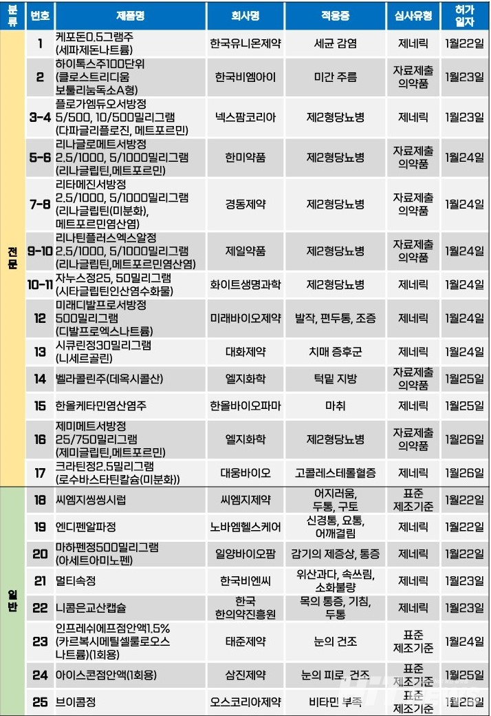 지난주(1월 22~26일) 총 25개 품목이 식품의약품안전처로부터 품목허가를 받았다. 전문의약품은 17개 품목, 일반의약품은 8개 품목이었다. 이 의약품들은 미간 주름, 제2형 당뇨병, 발작, 치매 증후군, 고콜레스테롤혈증 등 다양한 적응증으로 허가됐다.