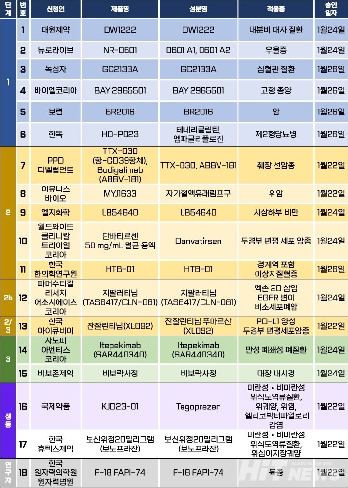 지난주 임상시험계획은 총 18건이 승인됐다. 세부적으로 △1상 6건 △2상 5건 △2b상 1건 △2/3상 1건 △3상 2건 △생물학적 동등성 2건 △연구자 임상 1건 등이다. 이 임상시험들은 내분비 대사질환, 우울증, 제2형 당뇨병, 시상하부 비만, 이상지질혈증, 만성 폐쇄성 폐질환 등 질환과 췌장 선암종, 위암, 두경부 편평세포암종, 비소세포폐암 등 암종을 대상으로 승인됐다.