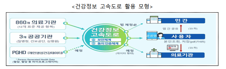 정부는 진료정보 교류 및 건강정보 고속도로와 같은 인프라를 기반으로 의료 마이데이터의 활용도를 높이면, 의료기관에서 환자의 병력 등을 참고한 개인 맞춤형 의료서비스를 제공할 수 있고, 불필요한 중복 검사 감소 등 의료 서비스의 효율화를 촉진할 것으로 기대하고 있다.