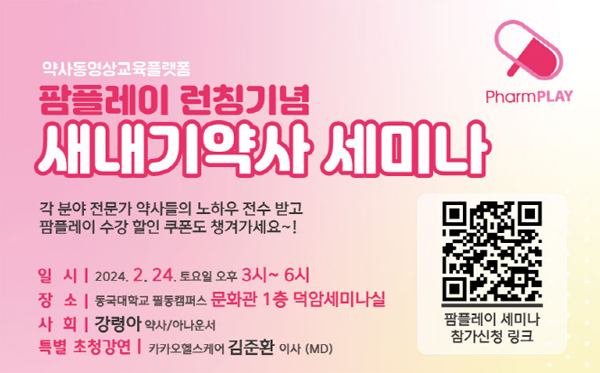 약사들에게 꼭 필요한 임상 강의를 비롯해 ①약국 실무 ②환자 커뮤니케이션 ③영어 복약지도 등 다양한 주제의 강의를 제공하는 약사 교육 동영상 강의 플랫폼 팜플레이(대표 이지현 약사)가 이달 24일 오후 3시부터 6시까지 동국대 필동캠퍼스 문화관에서 론칭 기념 '새내기약사 세미나'를 개최한다.