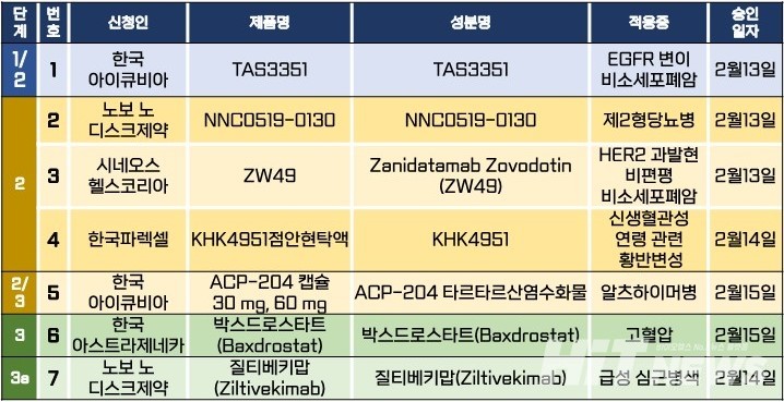 지난주 임상시험계획은 총 7건이 승인됐다. 세부적으로 △1/2상 1건 △2상 3건 △2/3상 1건 △3상 1건 △3a상 1건 등이다. 이 임상시험들은 제2형 당뇨병, 고혈압, 급성 심근경색, 신생혈관성 연령 관련 황반변성, 알츠하이머병 등 질환과 EGFR 변이 또는 HER2 과발현 비소세포폐암 등 암종을 대상으로 승인됐다.