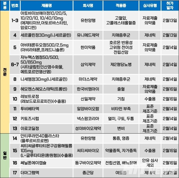 지난주(2월 12~16일) 총 17개 품목이 식품의약품안전처로부터 품목허가를 받았다. 전문의약품은 13개 품목, 일반의약품은 4개 품목이었다. 이 의약품들은 고혈압, 고콜레스테롤혈증, 제2형 당뇨병, 치매 증후군, 호르몬 반응성 고위험 전이성 전립선암 등 다양한 적응증으로 허가됐다.