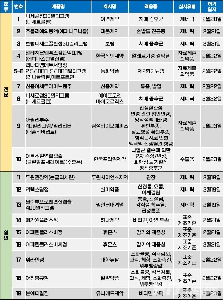 지난주(2월 19~23일) 총 19개 품목이 식품의약품안전처로부터 품목허가를 받았다. 전문의약품이 10개 품목, 일반의약품은 9개 품목이었다. 이 의약품들은 제2형 당뇨병, 치매증후군, 손발톱 진균증, 알레르기성 결막염, 신생혈관성 연령 관련 황반변성 등 다양한 적응증으로 허가됐다.