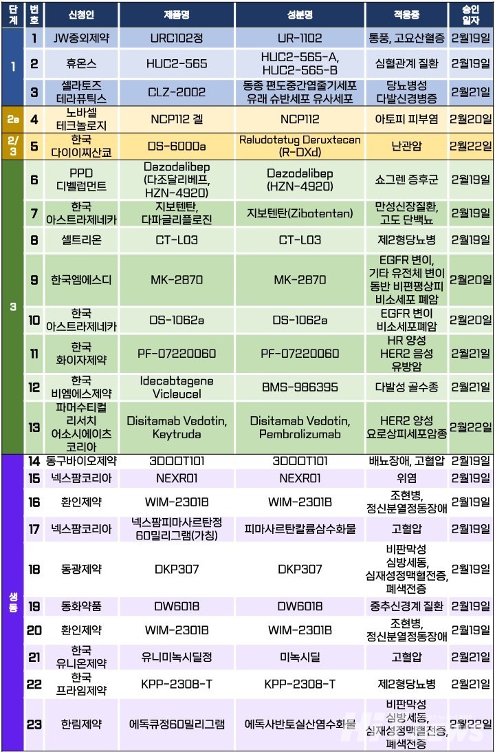 지난주 임상시험계획은 총 23건이 승인됐다. 세부적으로 △1상 3건 △2a상 1건 △2/3상 1건 △3상 8건 △생물학적 동등성 10건 등이다. 이 임상시험들은 통풍, 당뇨병성 다발신경병증, 아토피 피부염, 쇼그렌 증후군, 만성신장질환, 제2형 당뇨병 등 질환과 난관암, 비소세포폐암, 유방암, 요로상피세포암, 다발성 골수종 등 암종을 대상으로 승인됐다.