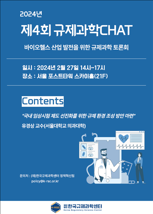 한국규제과학센터(센터장 박인숙)이 27일 오후 2시부터 서울 중구 포스트타워 스카이홀에서 제4회 '규제과학CHAT, 바이오헬스 산업 발전을 위한 규제과학 토론회(이하 규제과학CHAT)'를 개최한다.