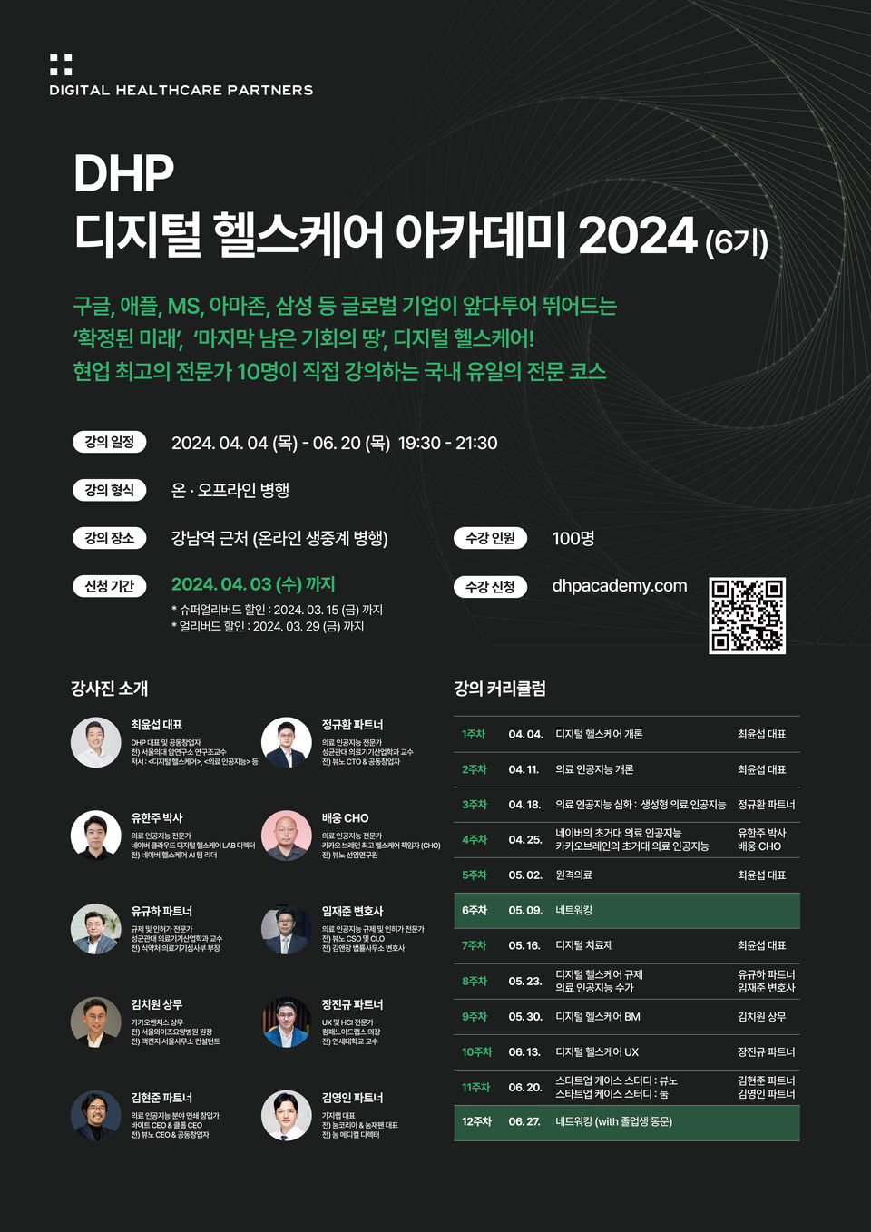 디지털 헬스케어에 대한 전문 교육 과정이 개설된다. 디지털 헬스케어 전문 투자사인 디지털헬스케어파트너스(대표 최윤섭ㆍ이하 DHP)는 디지털 헬스케어 분야 전반을 깊이 있게 다루는 전문 교육 과정인 'DHP 디지털 헬스케어 아카데미 2024'를 개설하고, 수강생 모집을 시작했다고 27일 밝혔다.