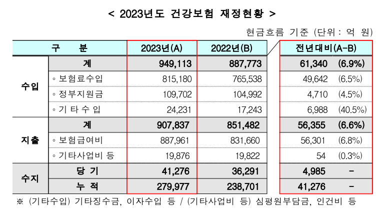 총수입은 직장 보험료수입, 정부 지원, 이자수입 등 증가로 전년 대비 6조 1340억 원(6.9%) 증가했다. 2단계 부과체계 개편(2022.9월 시행)으로 지역가입자 보험료 부담이 경감됐으나 인플레이션으로 인한 명목임금 상승으로 직장가입자의 보수월액이 전년 대비 증가(4.7%)했고, 이에 따라 연말정산보험료도 증가한 것이다(6000억원↑).