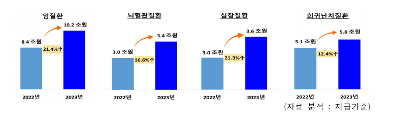 질환별로 살펴보면, 중증외 질환은 2022년보다 의료이용(입내원일수)이 둔화되는 경향을 보인 반면, 치료가 꼭 필요한 중증질환은 의료이용이 회복되는 추이를 보였다. 특히, 4대 중증질환(암질환, 뇌혈관질환, 심장질환, 희귀난치질환) 급여비는 전년 대비 10~20% 이상 증가 추세를 나타냈다.