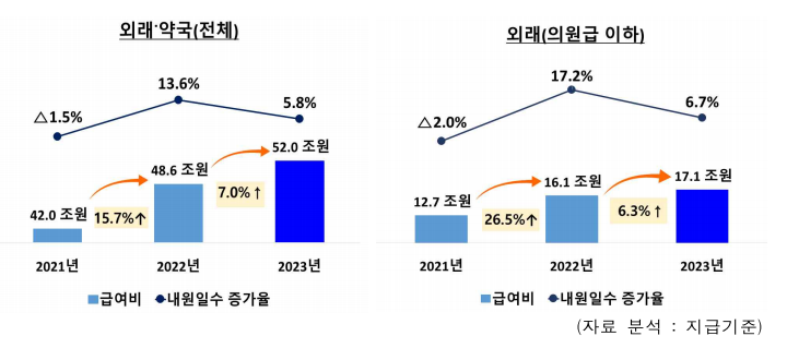 진료형태별로는 중증질환자 비중이 높은 입원의 경우 20년보다 의료이용(입원일수)이 회복돼 병원급 이상 입원 급여비도 높은 증가 추세를 보인 반면 의원급 이하 외래의 경우 의료이용(내원일수)이 줄어 급여비도 둔화되는 경향을 보였다.