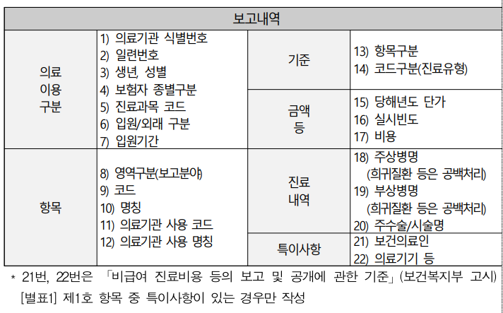 의료기관의 장은 각 비급여 보고항목별 단가, 빈도, 상병명, 주수술명 등을 보고해야 하며 병원급 이상 의료기관은 연 2회(3, 9월분 진료내역), 의원급 의료기관은 연 1회(3월분 진료내역) 보고한다.