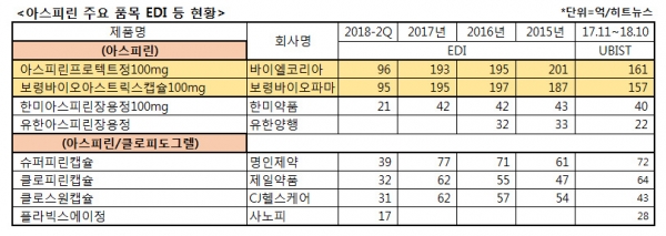 히트뉴스가 2015~2018년 상반기까지 건강보험청구(EDI) 데이터를 기반으로 아스피린 시장을 분석한 결과, 아스피린프로텍트는 올 상반기까지 96억을 청구하면서 95억을 기록한 보령바이오파마의 ‘보령바이오아스트릭스캡슐100mg'을 간발의 차로 따돌리고 1위에 올라섰다.