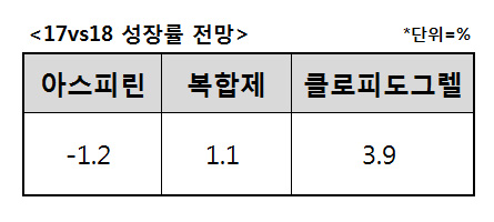 한편, EDI 청구액 상위 1000품목 내에서 항혈전 효능을 나타내는 의약품의 전년대비 성장률 전망치를 올 상반기 청구액을 기준으로 추정해보면 아스피린은 -1.2%로 역성장할 것으로 보이고 아스피린 복합제는 1.1%, 클로피도그렐은 3.9%의 성장률을 기록할 것으로 예상됐다.