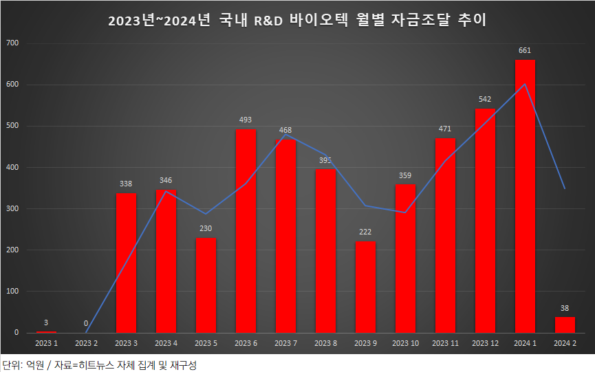 작년 9월부터 다섯달 간 이어진 R&D 바이오텍의 조달 규모 증가세(2023년 9월 222억원 → 2023년 10월 359억원 → 2023년 11월 471억원 → 2023년 12월 542억원 → 2024년 1월 661억원)도 꺾였다. 자금 조달 규모로만 놓고 보면 바이오텍 관계자들이 최악의 자금 조달 난을 호소하던 작년 초로 돌아간 모습이다.