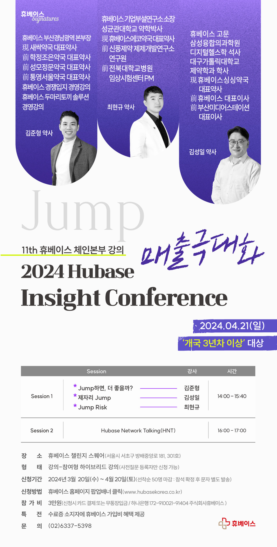 김수길 휴베이스 프랜차이즈 부문 이사는 "매년 개국 관련 강의는 우후죽순 늘어나지만, 개국 후 다수의 약사가 고민하는 점프 관련 강의는 거의 없다"며 "HIC에서는 점프 경영의 성공과 어려움을 모두 경험한 3명의 강사가 점프의 혜택과 위험요소를 세세하게 다룰 예정"이라고 말했다.